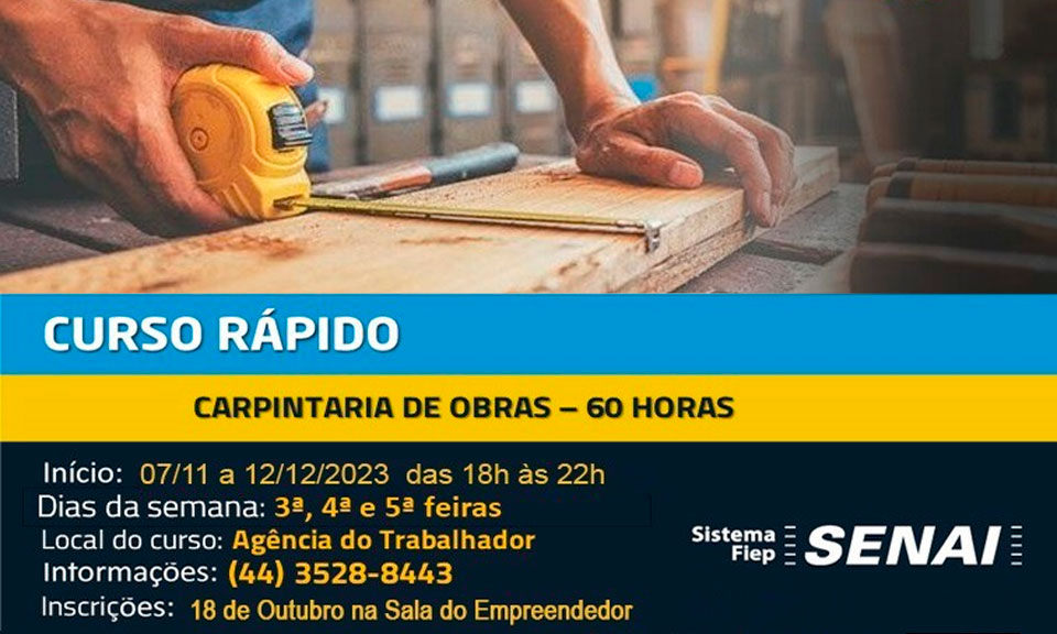 O município de Assis Chateaubriand, por meio da Secretaria de Trabalho, Emprego e Turismo, informa que estão abertas as inscrições para o Curso de carpintaria de obras. O curso é gratuito e será realizado na Agência do Trabalhador (Sine), com início no dia 7 de novembro e término em 12 de dezembro, nas terças, quartas e quintas-feiras, das 18h às 22h, com 60 horas de duração.