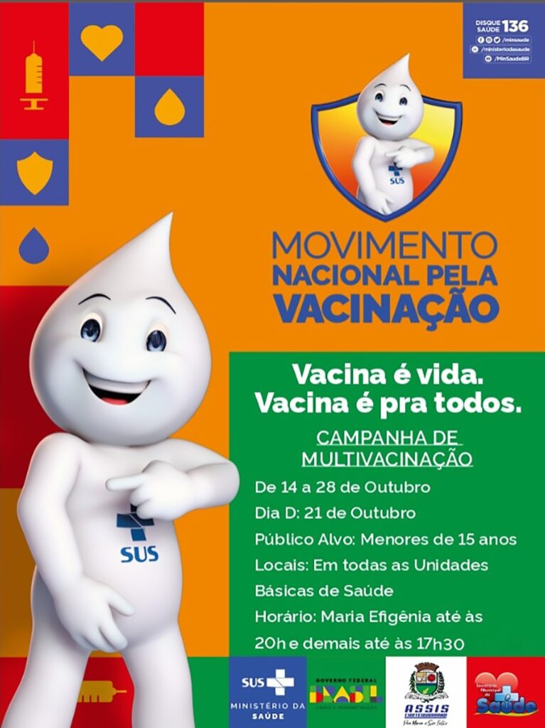 O Governo de Assis Chateaubriand, através da Secretaria de Saúde, promove a Campanha de Multivacinação para crianças e adolescentes menores de 15 anos, como parte do Movimento Nacional pela Vacinação. A campanha, que acontece entre os dias 14 e 28 de outubro, tem como objetivo atualizar a carteirinha de vacinação e garantir que todas as crianças e adolescentes estejam imunizados contra diversas doenças.