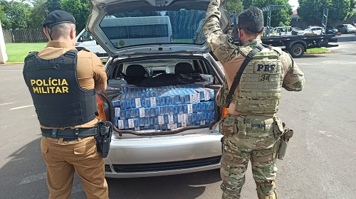 Foram realizadas buscas como intuito de localizar o indivíduo, porém o mesmo não foi localizado. Já no interior do veículo, constatou-se estar carregado de cigarros de origem paraguaia, da marca Fox, com aproximadamente 10 caixas alocadas em seu interior.