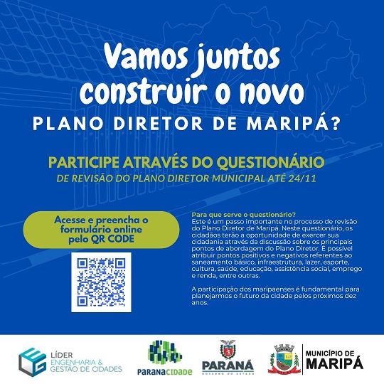 O Governo Municipal de Maripá disponibiliza, a partir desta terça-feira (24), um questionário online para que a população participe desta nova etapa de Revisão do Plano Diretor Municipal – PDM. O formulário estará disponível até o dia 24 de novembro no site oficial do município www.maripa.pr.gov.br ou pode ser acessado diretamente pelo link https://bit.ly/493khwr .