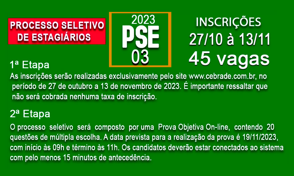 As inscrições serão realizadas exclusivamente pelo site www.cebrade.com.br, no período de 27 de outubro a 13 de novembro de 2023. É importante ressaltar que não será cobrada nenhuma taxa de inscrição.
