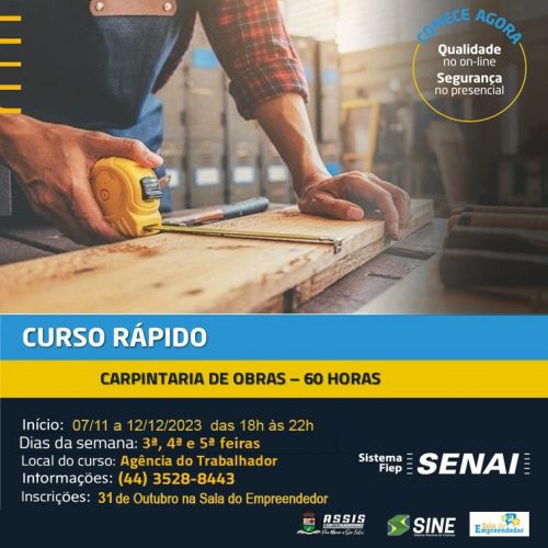 O município de Assis Chateaubriand, por meio da Secretaria de Trabalho, Emprego e Turismo, informa que estão abertas as inscrições para o Curso de carpintaria de obras.