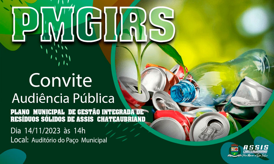 O município de Assis Chateaubriand convida todos os munícipes para a Audiência Pública de apresentação da atualização do Plano Municipal de Gestão Integrada de Resíduos Sólidos (PMGIRS) de Assis Chateaubriand, a ser realizada no dia 14 de novembro de 2023, às 14h, no Auditório da Prefeitura.