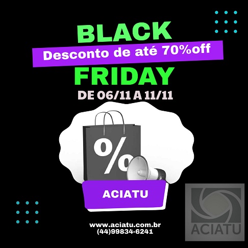 A Associação Comercial Industrial e Agropecuária de Tupãssi – ACIATU e as lojas associadas realizam Black Friday de 6 a 11 de novembro com descontos de até 70%. Serão diversas empresas com preços e produtos em condições incríveis. Atenção lojistas: A Black Friday é um momento de pensar além. Não faça apenas uma venda, conquiste o cliente antes, durante e depois. Boas vendas.