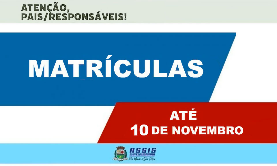 A Secretaria Municipal de Educação de Assis Chateaubriand está informando aos pais e responsáveis que as matrículas para 2024 estão sendo realizadas até sexta-feira (10), nas 15 Escolas Municipais e para os 5 Centros Municipais de Educação Infantil. Os pais e responsáveis devem procurar a Secretaria de Educação e Cultura