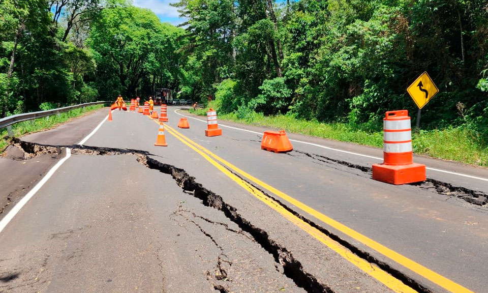 PR-092 em Rio Branco do Sul – Bloqueio total devido ao surgimento de rachaduras no pavimento na altura do km 48. O DER/PR estuda soluções para recuperar o trecho e melhorias a curto prazo para retomar a trafegabilidade.