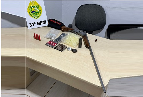Durante uma revista no terreno, foi localizado uma espingarda cal 36, juntamente com munições do mesmo calibre e pólvora.