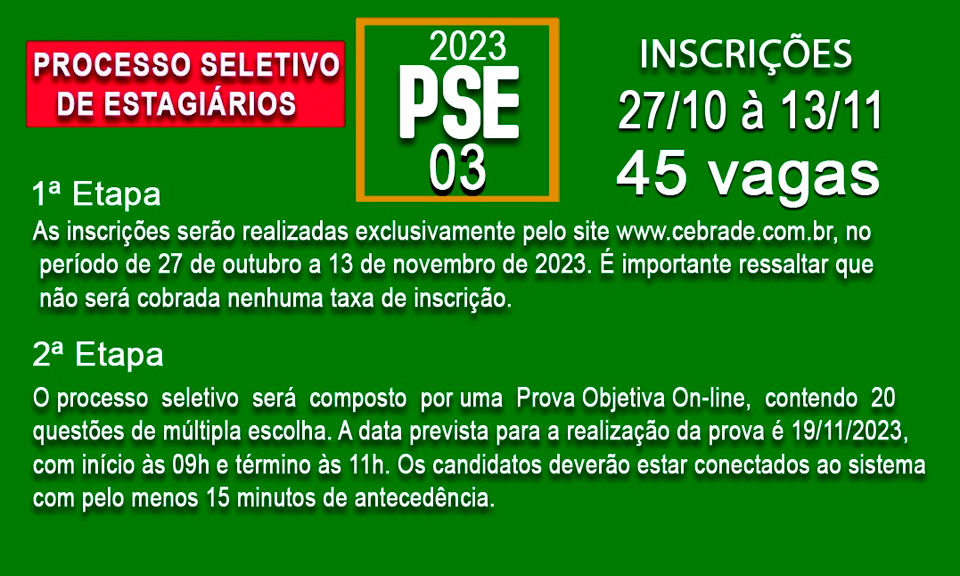 As inscrições serão realizadas exclusivamente pelo site www.cebrade.com.br, até o dia 13 de novembro de 2023. É importante ressaltar que não será cobrada nenhuma taxa de inscrição.