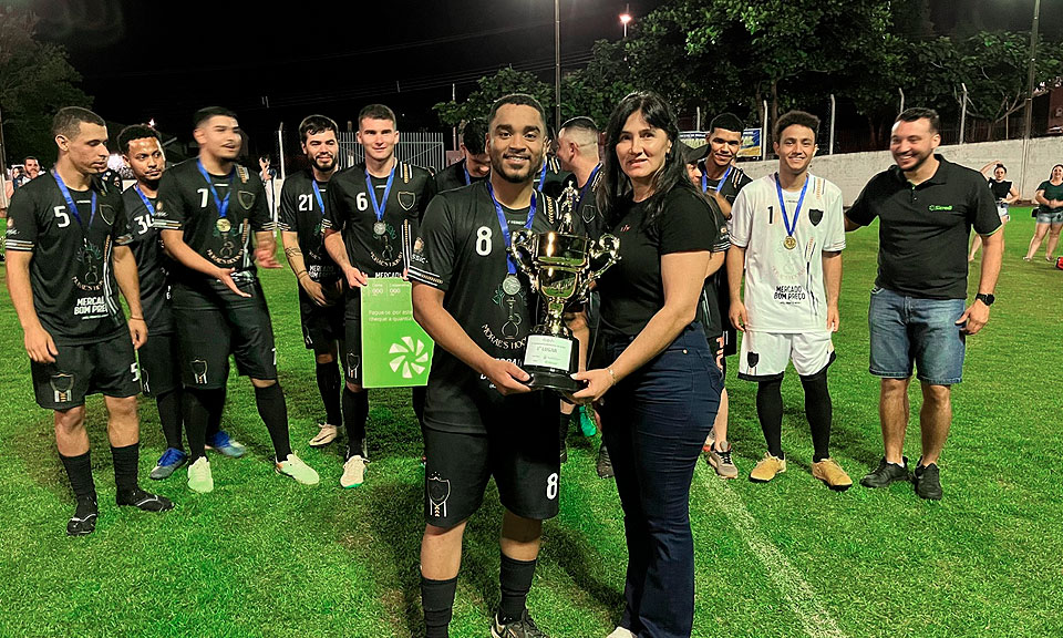 Prefeita Elza entrega o Troféu de 1º Lugar ao Capitão Gustavo Bernardino da equipe Moraes Conveniência.