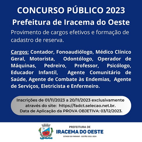 O Município de Iracema do Oeste publicou recentemente o Edital visando à realização de concurso público para provimento de cargos efetivos e formação de cadastro de reserva. Os cargos previstos no concurso são Contador, Fonoaudiólogo, Médico Clínico Geral, Motorista, Odontólogo, Operador de Máquinas, Pedreiro, Professor, Psicólogo, Educador Infantil, Agente Comunitário de Saúde, Agente de Combate às Endemias, Agente de Serviços, Eletricista e Enfermeiro.