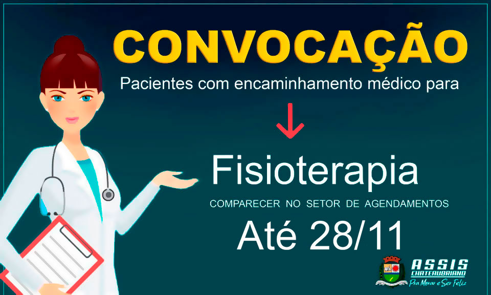 A Secretaria de Saúde de Assis Chateaubriand, convoca pacientes que devem comparecer no Setor de Agendamento do Posto de Saúde Central, até o dia 28 de novembro. As pessoas devem apresentar a solicitação médica para Fisioterapia e que já estavam aguardando vagas.
