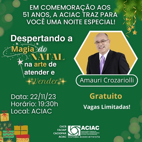 “Despertando a magia do Natal na arte de atender e vender”, é o tema da palestra de Amauri Crozariolli, que a ACIAC promove nesta quarta-feira, 22, a partir das 19h30. O evento marca as comemorações dos 51 anos da entidade.