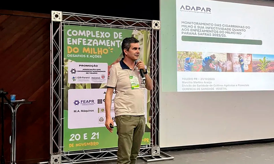 Na segunda-feira (20), técnicos da Adapar apresentaram resultados do monitoramento do milho e sua infectividade em relação aos enfezamentos durante a safra 2022/2023 no evento “Complexo de Enfezamento do Milho: Desafios e Ações”, no Centro de Eventos Ismael Sperafico.