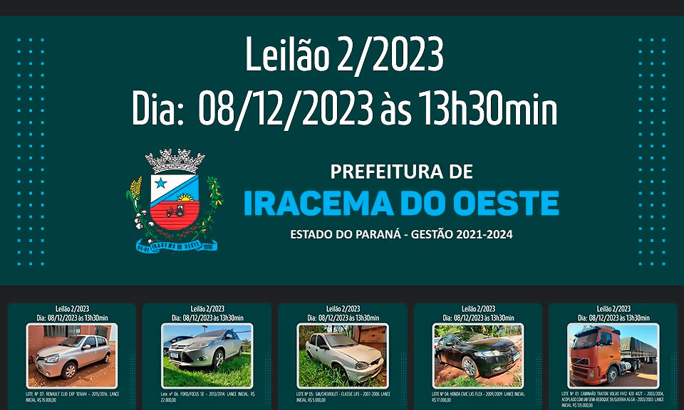 A Administração de Iracema do Oeste irá realizar no dia 08 de dezembro, nas dependências da Câmara Municipal, localizada na Avenida São Paulo, nº 133, às 13h30, o Leilão 2/2023, que tem por objeto a alienação de bens constituídos de veículos de diversas marcas e modelos, conforme imagens ilustrativas. As inscrições serão realizadas na mesma data e local, com início às 11h30 e encerramento às 13h25. Os que estiverem na fila de inscrição no horário exato de encerramento receberão uma senha que lhe darão o direito de concluir a inscrição.