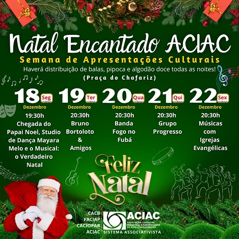 O comércio de Assis Chateaubriand atenderá em horário especial de 18 a 23 de dezembro para fomentar as vendas de Natal. Para movimentar ainda mais, de 18 a 22 acontece o Natal Encantado ACIAC com apresentações culturais, distribuição de balas, pipoca e algodão doce na Praça do Chafariz.
