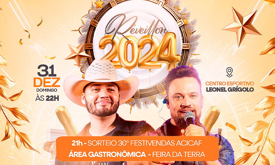 O evento terá início às 21h, com o último sorteio do 30º Festivendas – Acicaf Premiada, que vai sortear 40 vale compras e uma moto 0km. Após o sorteio, acontece o show e o tradicional espetáculo de fogos para brindar a chegada do novo ano. “O nosso Centro Esportivo se tornou o grande cartão postal de Cafelândia e neste ano, ele será palco da nossa virada. Com muita responsabilidade com os recursos públicos, celebraremos a chegada no ano novo com festa, alegria e harmonia. Convido a nossa comunidade para este momento especial de união e renovação”, destaca o prefeito Culestino Kiara.
