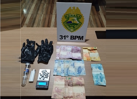 Após revista pessoal no indivíduo foi encontrado R$ 222,00 de posse dele e na varredura no ambiente, encontrado um frasco plástico transparente contendo 27 pedras de crack, pesando posteriormente 4,5 gramas, bem como um par de luvas pretas.