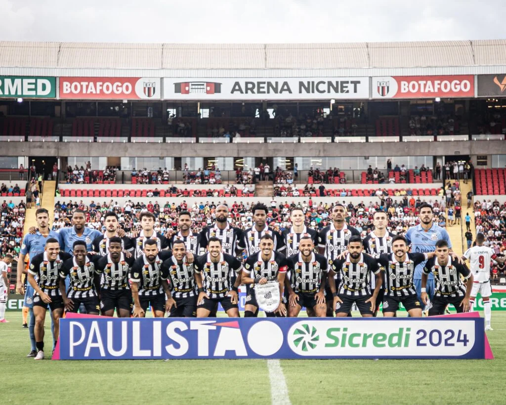 Muitas novidades! O time titular do Santos foi formado por sete atletas contratados para 2024 e apenas quatro que estavam desde o ano passado (João Paulo, Joaquim, Felipe Jonatan e Júlio Furch).