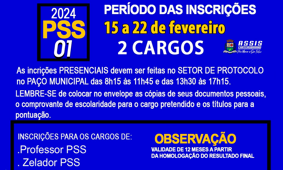 Publicado no diário oficial do município de Assis Chateaubriand nesta quinta-feira (, o edital nº017/ 2024, do Processo Seletivo Simplificado- PSS 01/2024 para contratação por prazo determinado de Professor PSS e Zelador PSS.
