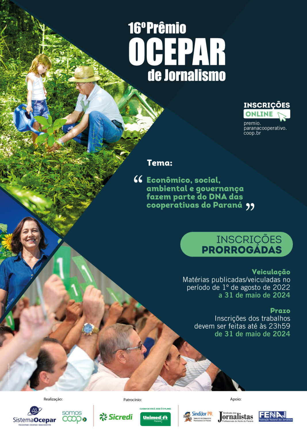 A Comissão Organizadora do 16º Prêmio Ocepar de Jornalismo, prorrogou para o dia 31 de maio de 2024, tanto a veiculação como a inscrição de trabalhos. Segundo o coordenador do prêmio, jornalista Samuel Milléo Filho, “esta prorrogação atende a várias solicitações realizadas por veículos de imprensa e de colegas jornalistas por um prazo um pouco maior. A data de inscrição neste ano ficou durante o período de vários feriados e de férias, impossibilitando que pudessem produzir conteúdo para participar. Desta forma, resolvemos prorrogar o prazo para dar oportunidade para que mais profissionais possam inscrever seus trabalhos”, lembrou.