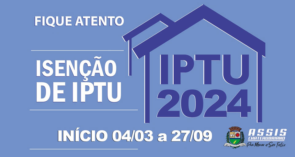 A Prefeitura de Assis Chateaubriand, por meio da Secretaria de Habitação e Assuntos Comunitários, informa que está em aberto o período para solicitação de isenção do IPTU (Imposto Predial e Territorial Urbano) referente ao ano de 2024. Os contribuintes têm até o dia 27 de setembro para requerer o benefício.