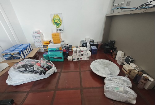 Durante a vistoria veicular foi constatado que o veículo estava transportando sacos contendo vários produtos oriundos do Paraguai, sem a devida comprovação fiscal, sendo eles: 66 aparelhos celulares de marcas diversas, 03 smartwatches, 03 switches, 01 receptor de TV, 30 caixas de som, 10 pacotes de meia, 44 perfumes de marcas diversas, 01 óleo capilar e 24 caixas de minoxidil.