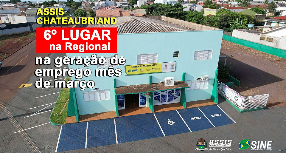 A Agência do Trabalhador, (Sine), de Assis Chateaubriand ficou em sexto lugar na Regional de Cascavel, com a colocação de 354 pessoas em diversas empresas de Assis Chateaubriand e região. A meta mínima era de 325 colocados, e o município superou essa expectativa, alcançando 109% a mais da meta estabelecida. Esse resultado demonstra que o planejamento realizado pela equipe, em parceria com as empresas, está obtendo os resultados esperados.