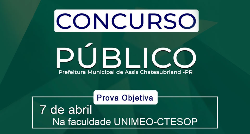 A prova objetiva do Concurso Público de Assis Chateaubriand será realizada na data de 07/04/2024 (domingo), na Faculdade Unimeo – Ctesop, situada à Avenida Brasil, 1441, Jardim Paraná. Os portões serão abertos às 8h e fechados às 8h40 e o início das provas será às 9h.