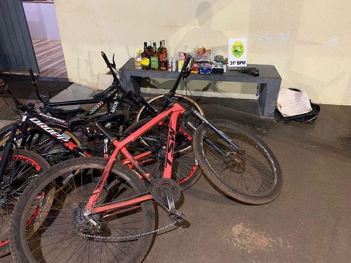 As equipes tentaram cerco na área de mata, porém não obteve êxito em localizar os indivíduos. No local foram encontradas quatro bicicletas, uma mochila preta contendo uma pistola de pressão, uma faca, cinco garrafas de whisky, duas garrafas de corote, 29 essências para narguilé, seis essências de cigarro eletrônico, cinco barras de chocolate, quatro cigarros eletrônicos, uma caixa de carvão para narguilé, dois pacotes de balas e r$ 64,35 (sessenta e quatro reais com trinta e cinco centavos) em moedas diversas e notas de pequeno valor. Os produtos recuperados foram entregues na 48ª DRP para as providências de polícia judiciária. Mediante os fatos foi confeccionado o presente boletim de ocorrência.