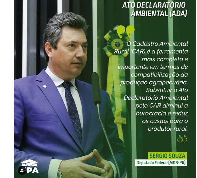 Com base na informação a nós enviada pelo deputado federal Sérgio Souza, a Cãmara Federal aprovou hoje, 10/04, o projeto que tira a burocracia e reduz os custos quando o produtor rural substitui o ADA (Ato Declaratório Ambiental) pelo CAR (Cadastro Ambiental Rural). No CAR já estão todas as informações necessárias para a apuração da área tributável sobre o valor que deve ser pago no Imposto Territorial Rural. É mais facilidade, agilidade e economia para os produtores.