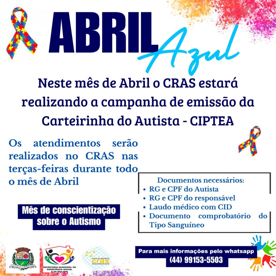 Durante o mês de abril o município de Assis Chateaubriand, por meio da Secretaria de Assistência Social e da Mulher e CRAS- Centro de Referência de Assistência Social, estará realizando a Campanha de Emissão da Carteirinha do Autista. Os atendimentos serão realizados nas terças-feiras, durante o mês de abril.