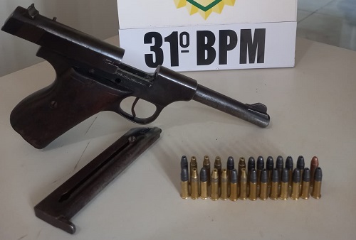 Diante disso, foi realizada abordagem e o condutor identificado, sendo que em revista pessoal foi localizada uma pistola calibre .22, no lado esquerdo da cintura, presa ao cinto da calça, carregada com 10 (dez) munições .22 CBC intactas no carregador. No bolso direito da calça, foi localizado mais 17 (dezessete) munições calibre .22 CBC, intactas.