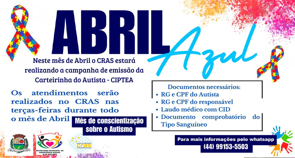 Durante o mês de abril o município de Assis Chateaubriand, por meio da Secretaria de Assistência Social e da Mulher e CRAS (Centro de Referência de Assistência Social), estará realizando a Campanha de Emissão da Carteirinha do Autista. Os atendimentos serão realizados nas terças-feiras, durante o mês de abril.