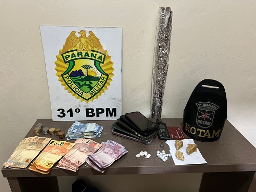 Também no guarda-roupas foi localizado notas de dinheiro de valores diversos, totalizando a quantia de R$ 568,00 em espécie. Foi localizado também 06 celulares de marcas diversas. Diante dos fatos, os três envolvidos foram encaminhados juntamente com os objetos para Delegacia de Polícia Civil.