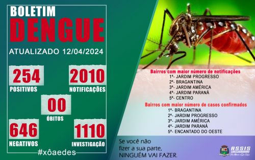 De acordo com o boletim, agora são 254 casos de dengue confirmados, notificações foram 2.010 Conforme dados, 646 foram descartados e 1.110 estão aguardando resultado. No último boletim divulgado eram 151 casos e agora são 254.Ainda conforme a Secretaria de Saúde os bairros com maior número de notificações de dengue até o momento são: Jardim Progresso, Distrito de Bragantina, América, Paraná e Centro.
