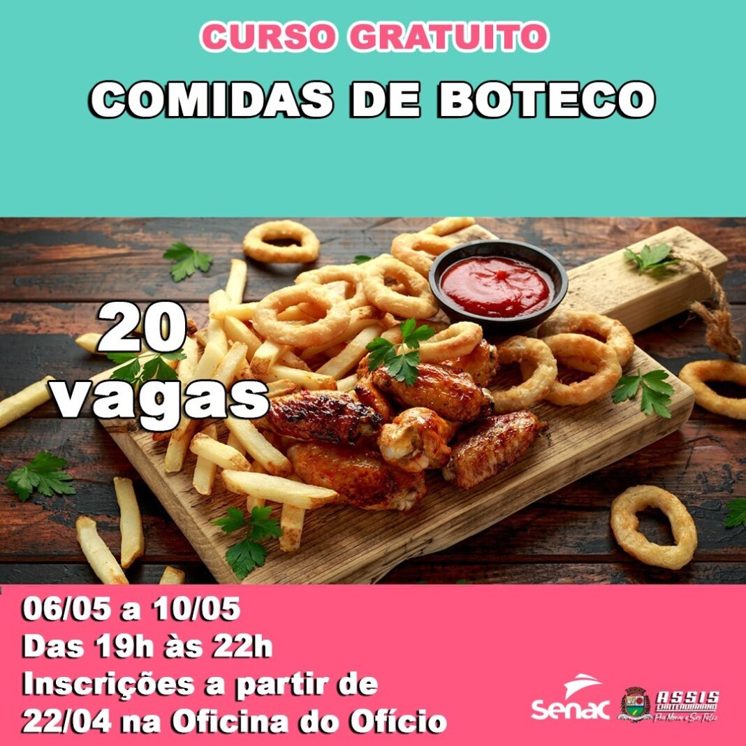 O Curso de Comidas de Boteco acontecerá do dia 6 até 10 de maio, com a disponibilização de 20 vagas. Já o Curso de Hambúrguer Gourmet será realizado do dia 13 até 17 de maio, também com 20 vagas disponíveis, sendo das 19h às 22h.