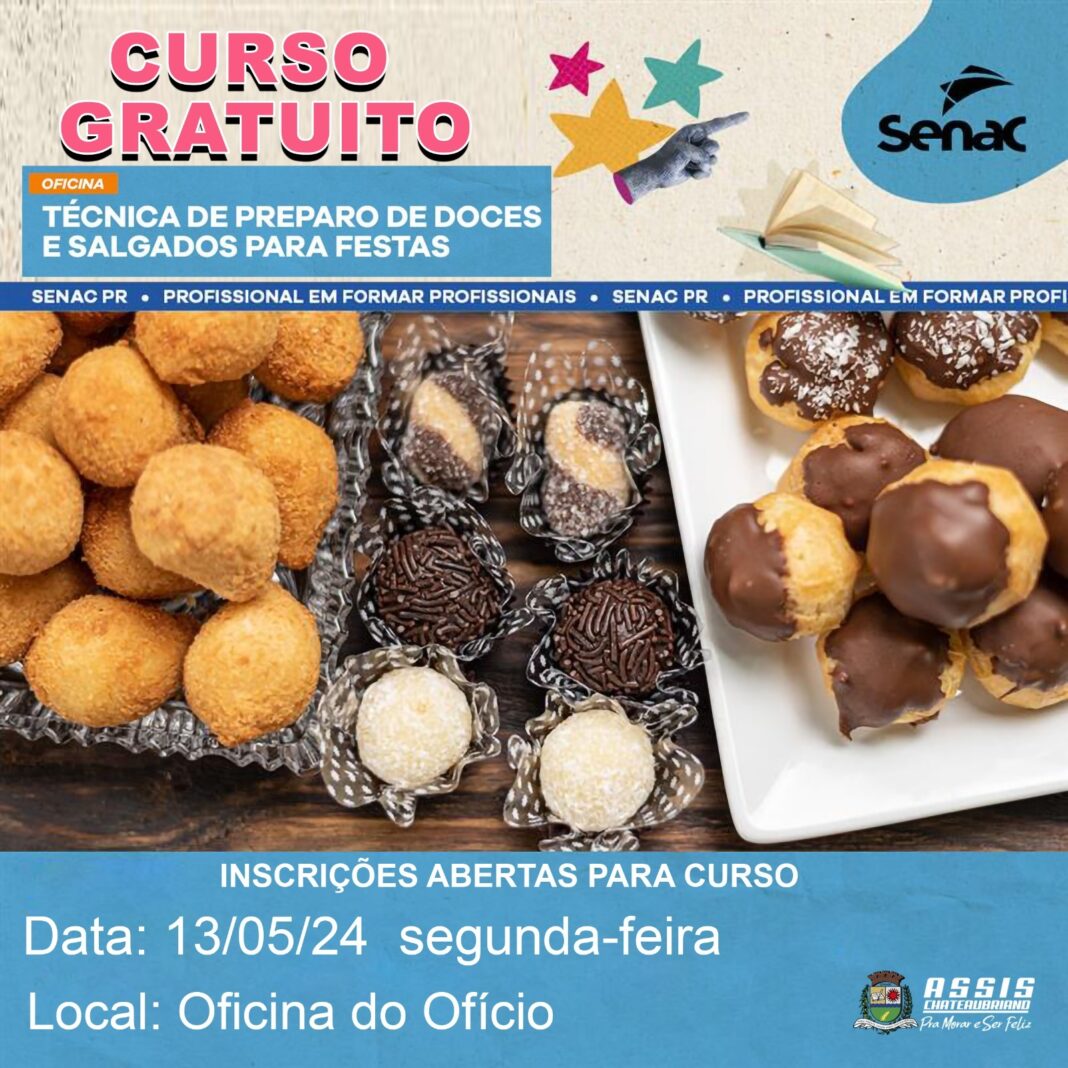 O curso de técnica de preparo de doces e salgados para festas terá início no dia 3 e seguirá até 11 de junho. Já o curso de preparo de pizzas terá início no dia 17 e seguirá até 21 de junho. As inscrições devem ser realizadas na Oficina do Ofício.