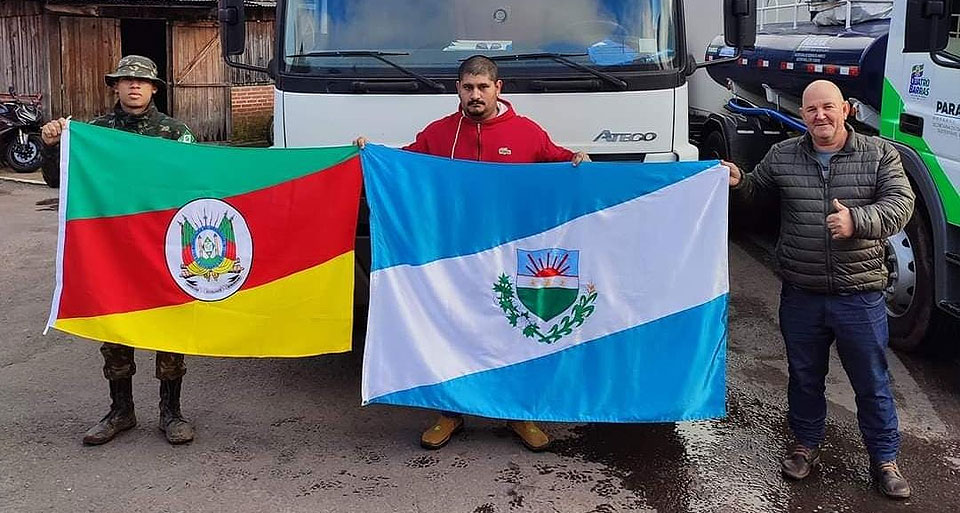 O Governo do Paraná encaminhou na segunda-feira (20) mais 30 caminhões-pipa e quatro caminhonetes 4×4 para ampliar a força-tarefa de apoio às vítimas das enchentes no Rio Grande de Sul. O comboio com 45 técnicos, entre servidores do Instituto Água e Terra (IAT) e agentes das prefeituras municipais que emprestaram os veículos, partiu às 8 horas de General Carneiro, no Sul do Estado, com destino a Santa Cruz do Sul, um dos municípios mais castigos pelas chuvas. Na frota, um dos caminhões pipas saiu de Brasilândia do Sul. O prefeito, Alex Cavalcante, atendeu o chamado feito pelo governador Ratinho Junior e enviou o caminhão pipa para ajudar os irmãos gaúchos. Na saída, o prefeito Alex entregou ao motorista Cândido Norberto Schizzi uma bandeira do Município, que foi exposta na chegada durante registro fotográfico. Rodrigo Americano Ferreira, também de Brasilândia do Sul, foi como voluntário. Inicialmente, o grupo ficará à disposição da Defesa Civil até o próximo dia 29.