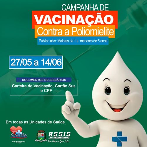 Campanha Nacional de Vacinação contra a Poliomielite inicia na segunda-feira (27)Em todas as Unidades Básicas de SaúdeA Secretaria de Saúde do município de Assis Chateaubriand informa à população sobre a realização da Campanha Nacional de Vacinação contra a Poliomielite, que ocorrerá no período de 27 de maio a 14 de junho, sendo que o dia 8 de junho será o dia “D” de divulgação e mobilização nacional.