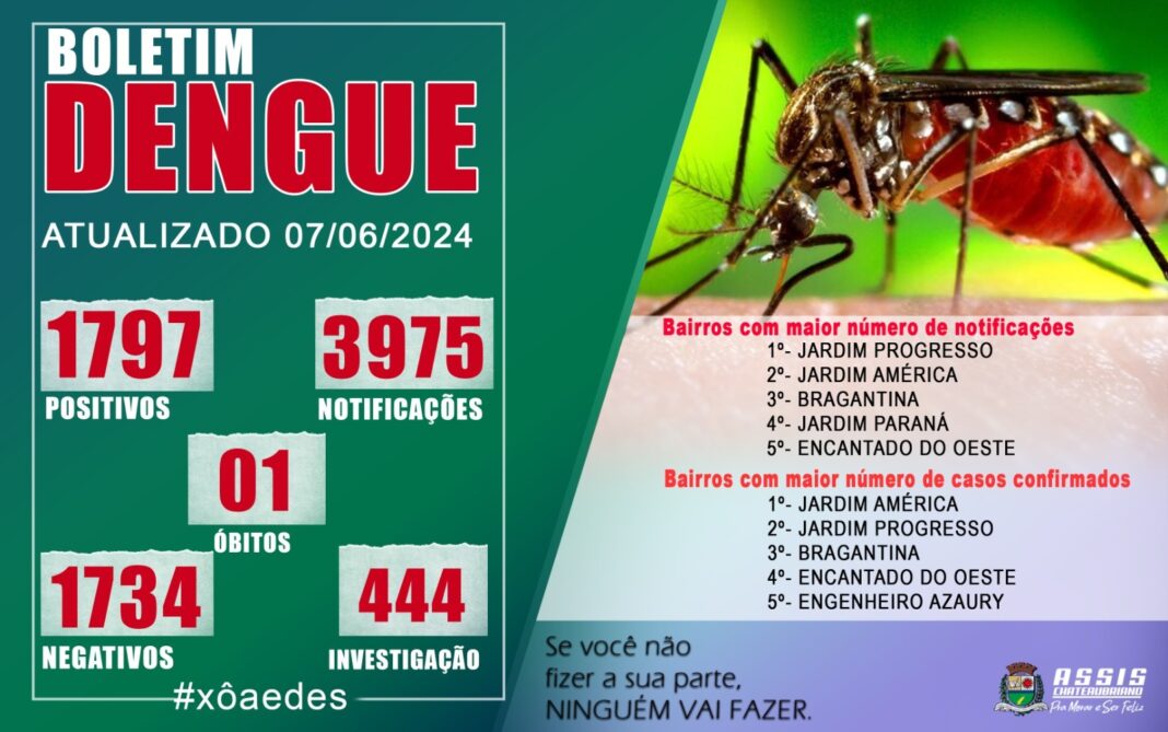 A Secretaria de Saúde de Assis Chateaubriand divulgou o décimo sexto boletim do ano, nesta sexta-feira (7), em relação à dengue no município neste ano. Conforme os dados, esse é o vigésimo segundo boletim do ano epidemiológico iniciado em 29 de julho de 2023. De acordo com o boletim, agora são 1.797 casos de dengue confirmados, notificações foram 3.975. Conforme dados,1.734 foram descartados e 444 estão aguardando resultado. No último boletim divulgado eram 1.730 casos e agora são 1.797.