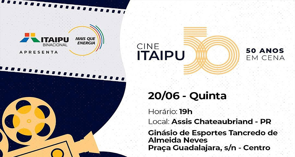 Na quinta-feira (20), o município de Assis Chateaubriand, vai receber o projeto “Cine Itaipu – 50 Anos em Cena”. A iniciativa visa levar arte e cultura a municípios do Paraná e Mato Grosso do Sul, integrando o programa Itaipu Mais que Energia. Será no estacionamento do Ginásio de Esportes Tancredo de Almeida Neves (GETAN), às 19h com distribuição de pipoca, água, mini refrigerante durante a exibição do filme. É uma maneira de proporcionar uma experiência completa, confortável e socialmente enriquecedora para o público