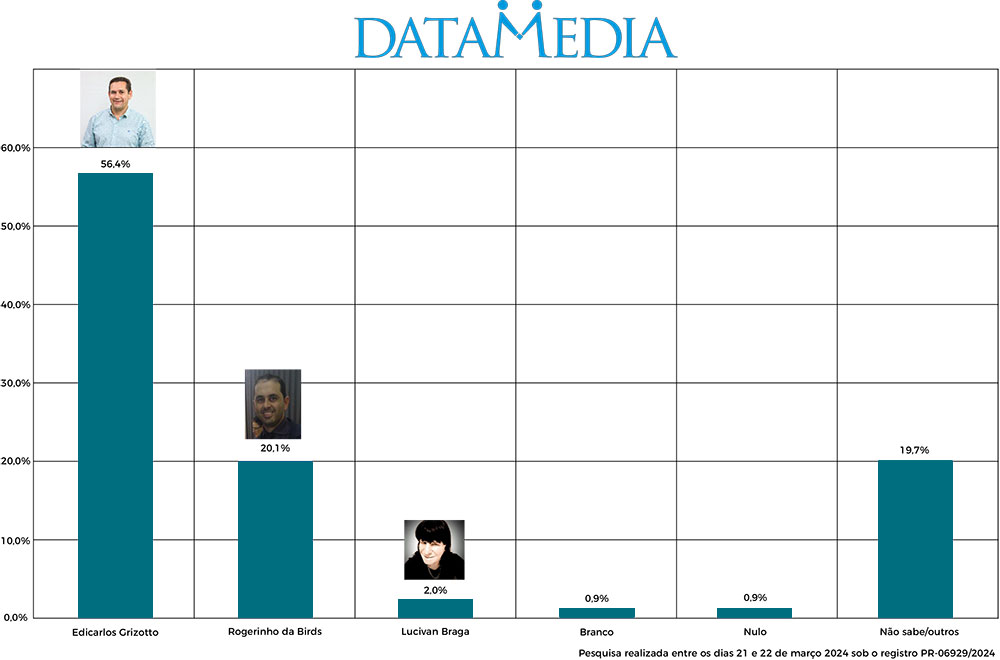 Grizotto aparece na primeira posição com 56,4%, na frente de Rogerinho da Birds com 20,1% e Lucivan Braga com 2% das intensões de votos para as eleições municipais que acontecerão em outubro. Foram realizadas 400 entrevistas, entre os dias 21 e 22 de março, cujo nível de confiança é de 95%, com margem de erro de 4,8%, para mais ou para menos.