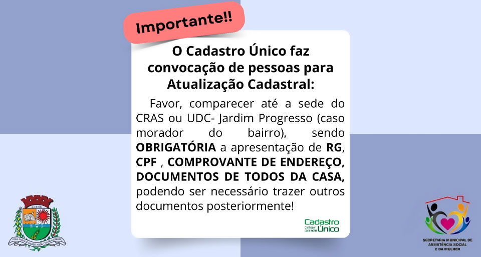 O Cadastro Único, é considerado uma das portas de entrada para vários benefícios governamentais destinados as famílias em situação de pobreza e extrema pobreza, além de ser fonte de importantes informações para o governo federal. Benefícios como o Bolsa família e BPC/LOAS dependem do cadastro estar atualizado, entre outros critérios. Por meio da Secretaria de Assistência Social e da Mulher, o Cadastro Único convoca as seguintes pessoas a realizarem atualização cadastral:
