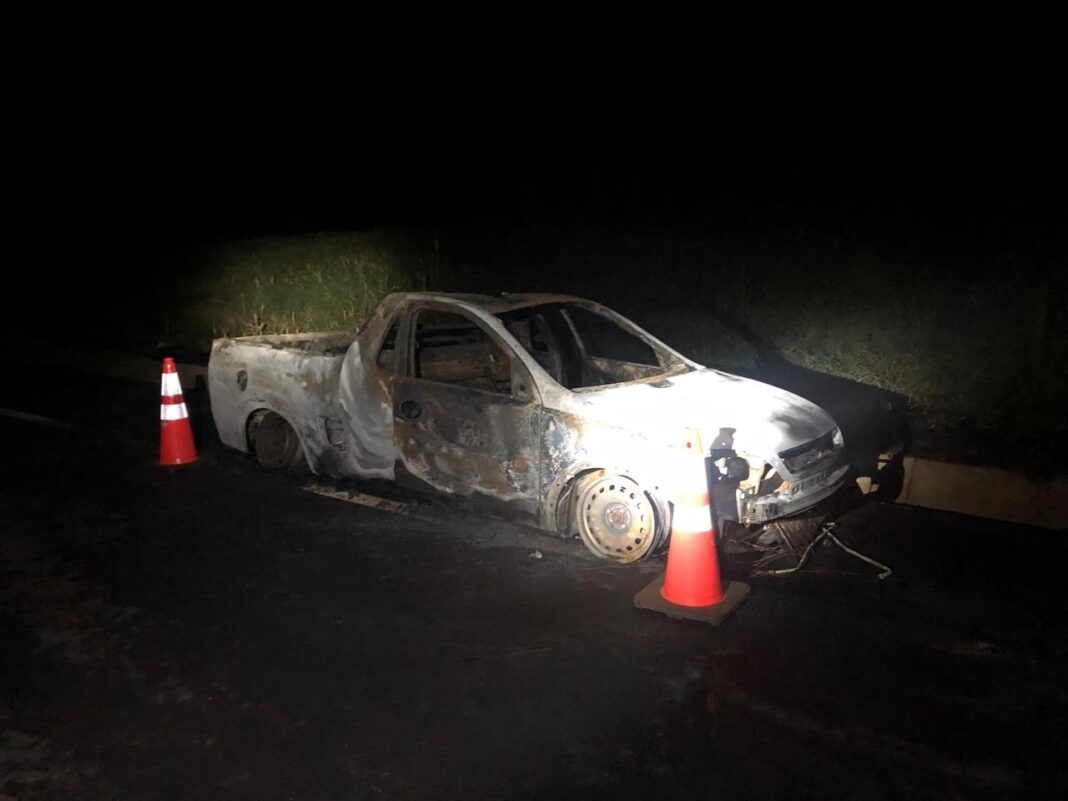 Após conter as chamas, o veículo foi identificado por uma das placas, confirmando ser uma caminhonete GM/Montana de cor preta com placas do Mercosul.