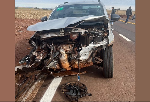 A PRE de Assis Chateaubriand, registrou um acidente de trânsito por volta das 14h20 de hoje (10), na rodovia PR 239, no km 610 + 400 metros, trecho que liga Assis Chateaubriand a Toledo, onde envolveu um Fiat Strada, conduzido por P.S.B., 29 anos de idade, de cor prata, município de emplacamento Belo Horizonte/MG e um GM Corsa, de cor prata, conduzido por M.H.G.C., 26 anos de idade, município de emplacamento Assis Chateaubriand/PR.