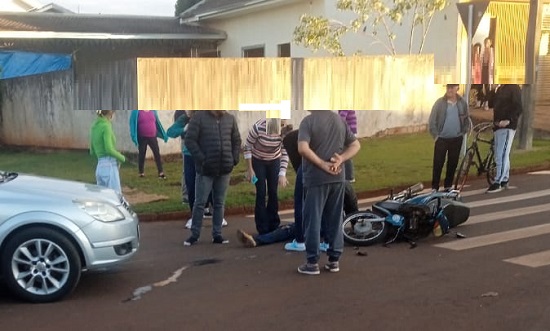 Um motociclista sofreu uma suspeita de fratura em uma das pernas, durante uma colisão na tarde desta quarta-feira (10), no cruzamento da Rua Chile com a Costa Rica, no Jardim América.