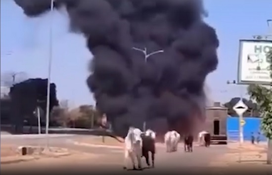 Bois que estavam sendo levados para um frigorífico, para serem abatidos, escapam de um caminhão durante incêndio.
