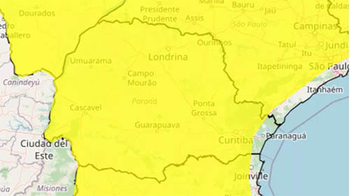 Um dos alertas diz respeito a uma onda de calor que se aproxima do Paraná e de estados como Mato Grosso do Sul, São Paulo, Santa Catarina e o norte do Rio Grande do Sul. Além do aumento das temperaturas, que podem ultrapassar os 30°C, a umidade relativa do ar ficará baixa nestas localidades, com um índice que varia entre 20% e 30%. Praticamente todo o Paraná está sob a área do alerta, com exceção da faixa litorânea.]