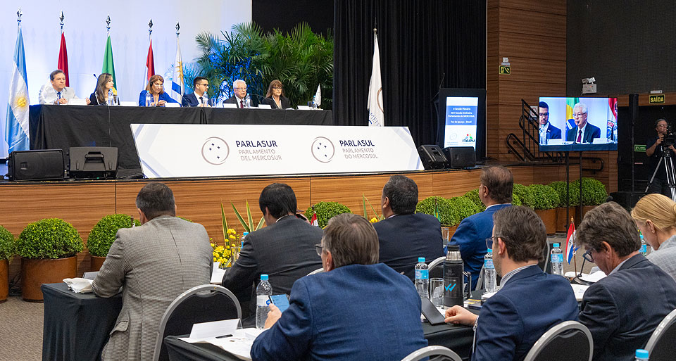 O Parlamento do Mercosul (Parlasul) realizou nesta segunda-feira (19), em Foz do Iguaçu (PR), sua 95ª Sessão Ordinária, reunindo mais de 80 parlamentares representantes de Brasil, Paraguai, Argentina, Uruguai e Bolívia. O encontro ocorreu no Cineteatro dos Barrageiros, dentro do Itaipu Parquetec, e contou com o apoio da Itaipu Binacional.