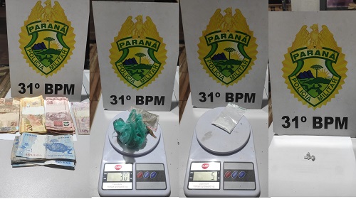 Na revista veicular, foi localizado mais drogas: quatro pedras de crack (0,01g), uma porção de haxixe (12g), um pacotinho de cocaína (5g) e cinco porções de maconha (30g no total) e R$ 490,00 em notas diversas.